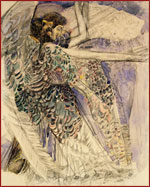 В последнем зале можно увидеть рисунки Врубеля, сделанные им в период обострения недуга, в клинике. Это несколько портретов и иллюстрация к "Царю Салтану". Трудно представить себе более грустное зрелище. Ничто не напоминает руки знаменитого художника, так беспомощны эти работы, будто неумелому ребенку дали в руки цветные карандаши. И тут же - быть может, самые изощренные вещи Врубеля - его перламутровые раковины. Особенно хороша не та знаменитая пастель с русалками под названием "Жемчужина" (она часто репродуцируется), а другая, менее известная. Посмотришь издали - драгоценным светом переливается перламутр. Подойдешь ближе - рисунок то сделан одним лишь черным углем по белой бумаге!